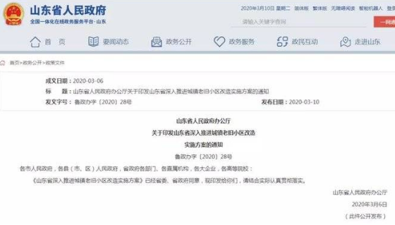 3月初,山东省政府印发《山东省深入推进城镇老旧小区改造实施方案》