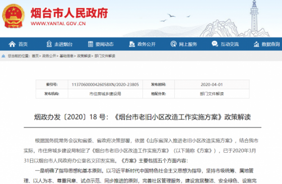 4月1日,《烟台市老旧小区改造工作实施方案》正式印发