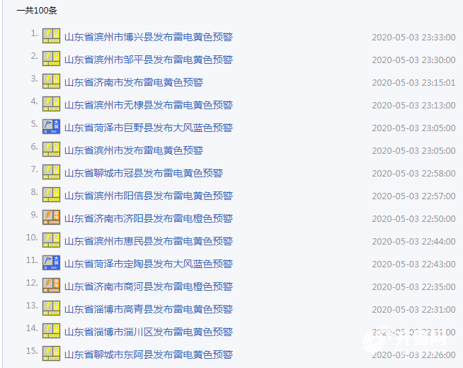省气象台于3日21时40分发布雷电黄色预警信号,预计3日夜间,德州、聊城、滨州南部、济南、淄博、泰安的部分地区有雷雨天气,伴有7~9级短时大风,局部地区有冰雹。雷电较强,可能会造成雷电灾害事故。目前,山东已发布100条雷电、大风预警。