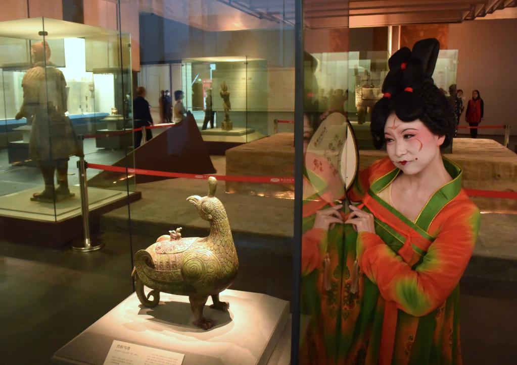 “唐宫小姐姐”探访郑州博物馆新馆推出的“黄河珍宝——沿黄九省(区)文物精品展”。新华社记者李文哲摄