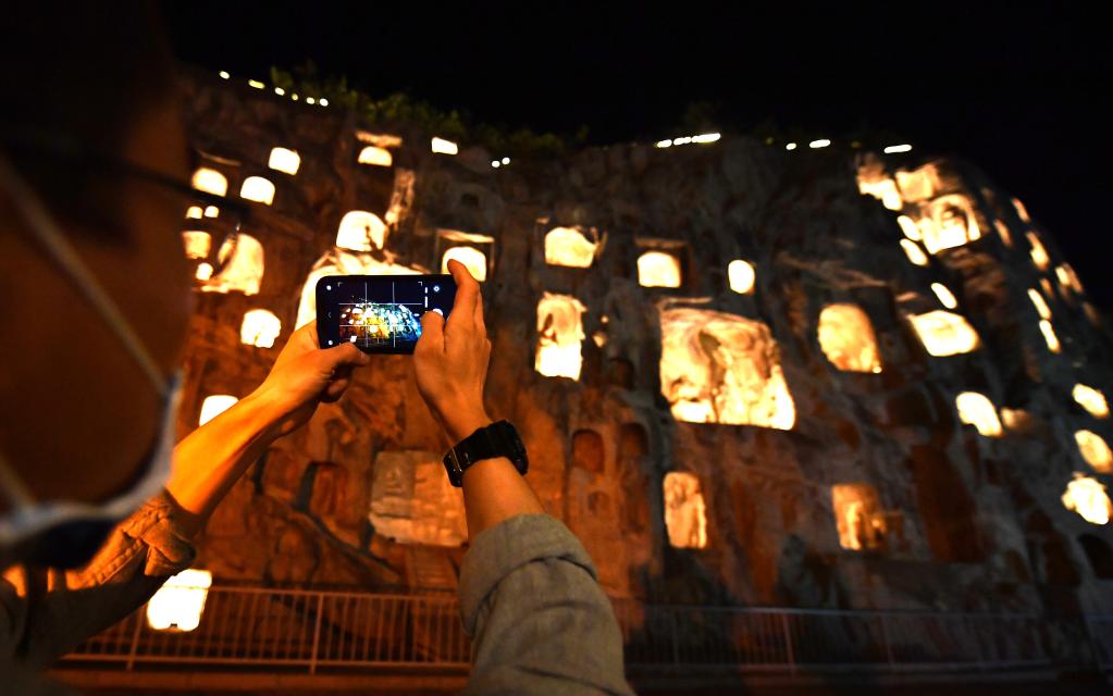 一名游客拍摄洛阳龙门石窟夜景。新华社记者 李嘉南 摄