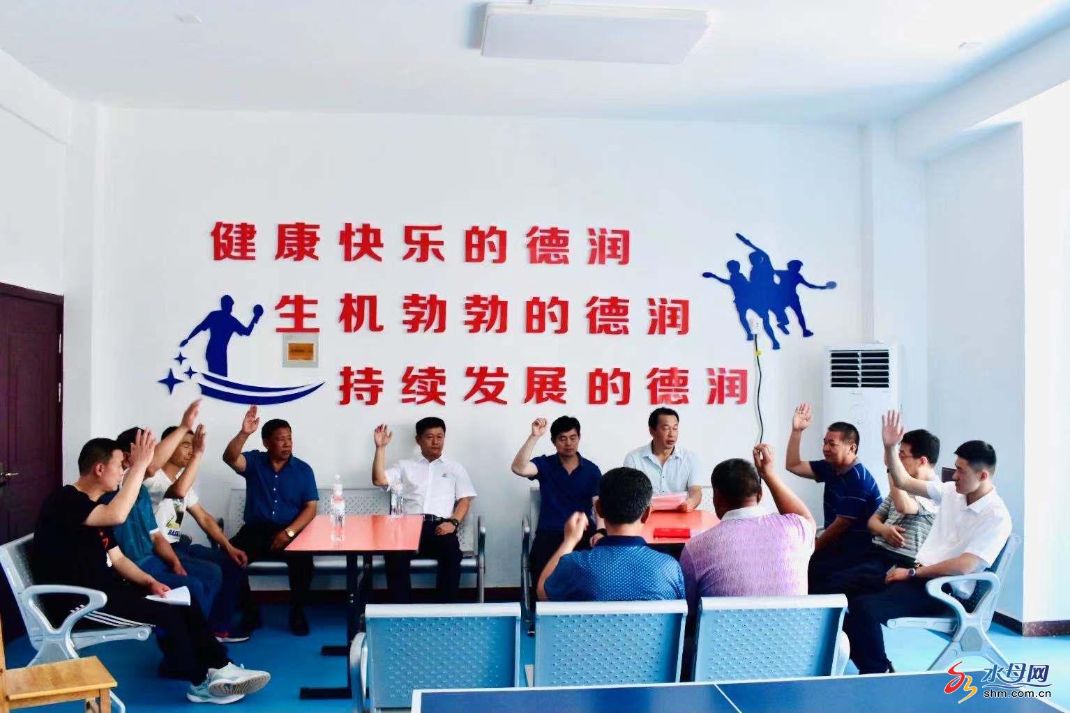 会议由招远市乒协副主席、秘书长范中勤主持。首先由招远市乒协杨丰杰副主席宣读《关于成立招远市乒协德润建筑分会的批复》文件,大会选举产生了首届德润建筑分会11人理事会成员。随即在小会议室召开理事会,选举产生了首届德润建筑分会领导班子:会长温瑞庆,名誉会长李文臣,副会长温守华,秘书长温福龙,市乒协盛玉卫副主席监督了选举的全过程。