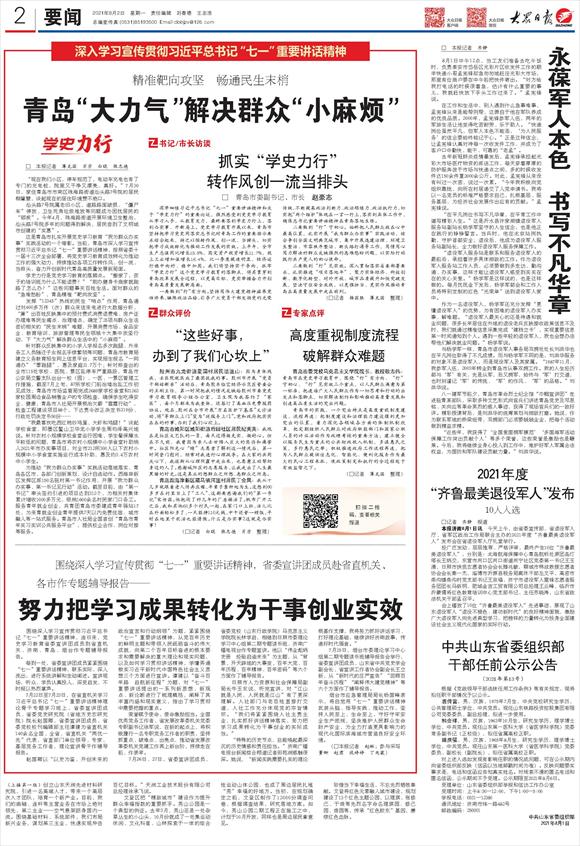 八一建军节前夕,青岛市革命烈士纪念馆“巾帼宣讲团”走进驻青某部队,采取多种文艺形式向官兵们讲述青岛党史及邓恩铭、关向应等革命英烈的感人事迹,获得了现场官兵们的一致好评。精彩授课背后,是刘洪华的统筹策划与细致打磨。她说,作为联系军地的桥梁纽带,双拥部门必须要兢兢业业,把每个活动做到精益求精。