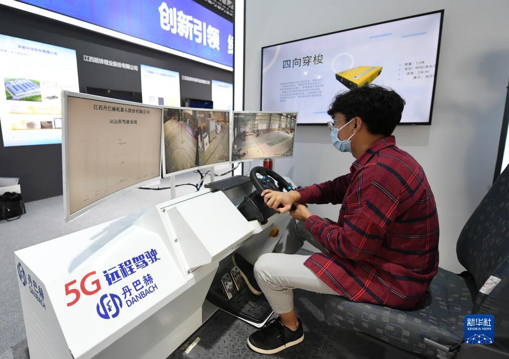 观众在2021中关村论坛展览(科博会)现场体验5G远程驾驶(9月25日摄)。新华社记者 任超 摄