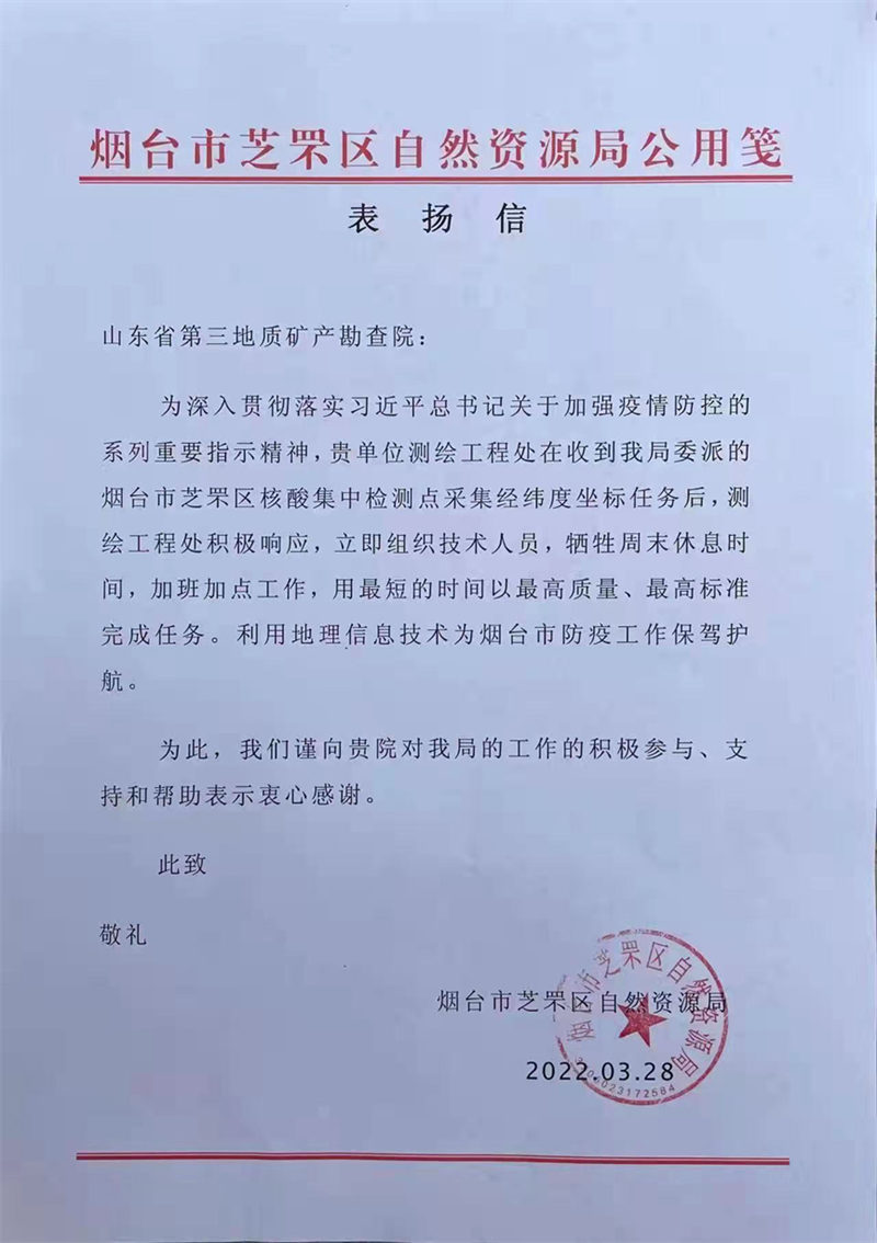 水母网3月30日讯(通讯员 刘晓)近日,省地矿局三院收到芝罘区自然资源局发来的感谢信,感谢三院测绘工程处为芝罘区疫情防控工作的支持。