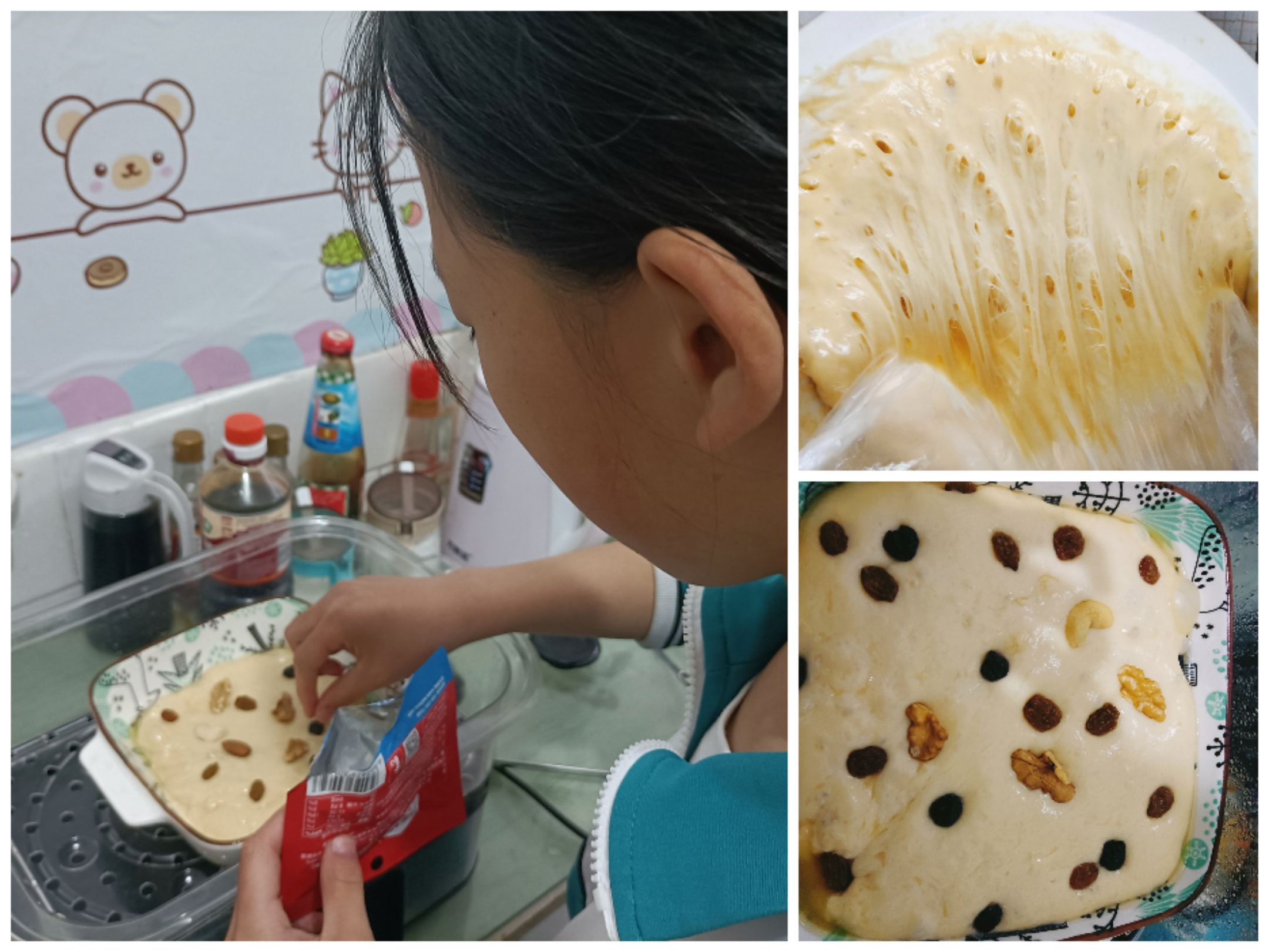 三个小时后,孩子们的面糊发酵好了,他们将大枣碎和葡萄干加入面糊中再次搅拌排气后,倒入模具蒸熟。