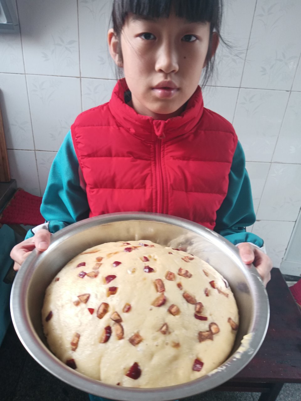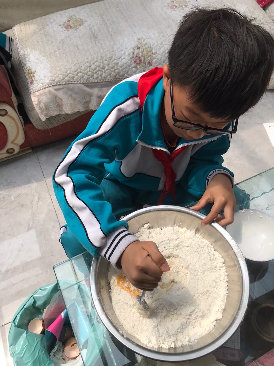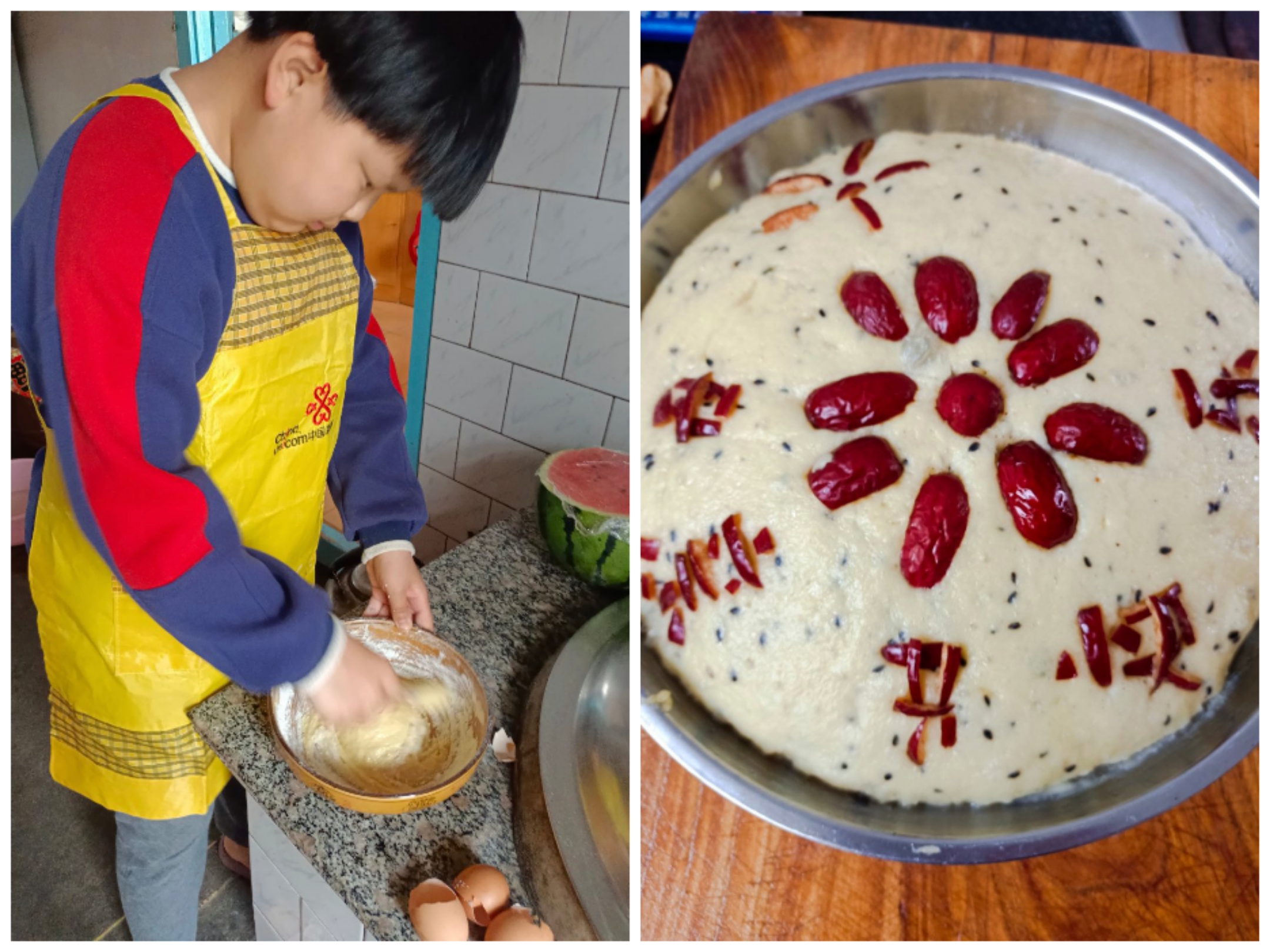 学校利用线上教学的机会,提前布置学生准备好面粉,鸡蛋,酵母,白糖,温水、葡萄干,大枣碎等,在线上劳动课中按步骤指导学生将适量酵母和白糖倒入面粉中,再加上2个鸡蛋,分次加入温水搅拌成浓稠的面糊,等到面糊变得细腻,没有小疙瘩时盖上盖子放到温暖的地方发酵。