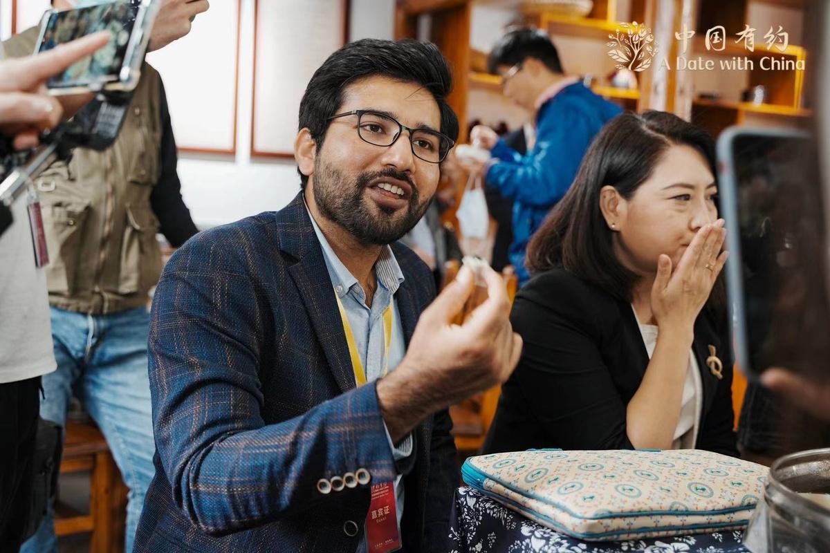 来自巴基斯坦的浙江大学留学生(左)正在品尝雪水港村的特色尺糕。