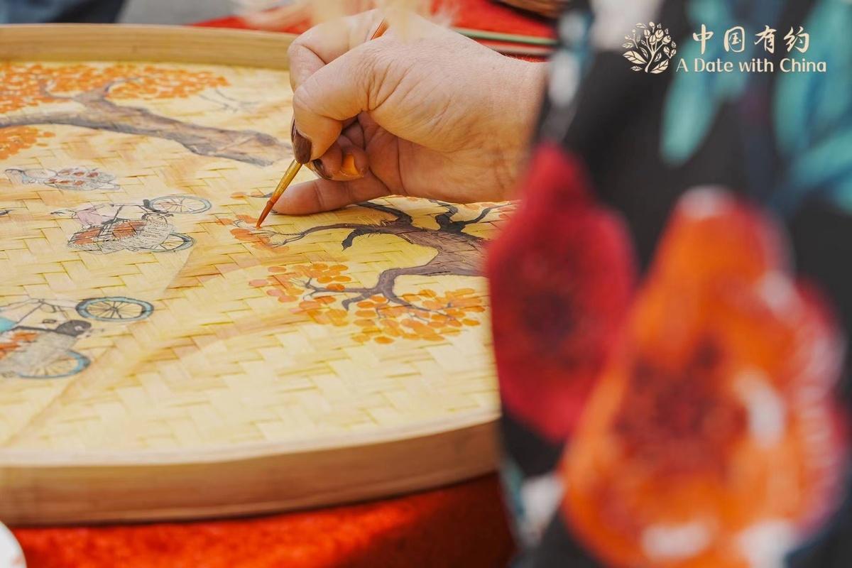 金秋落叶、田间公路、欢歌起舞……一幅幅美丽乡村的剪影跃然匾上。这些色彩炫丽的“蚕匾画” 吸引人们驻足拍照、观赏。外国记者和在华外籍网络名人还踊跃体验了蚕匾画的绘制。