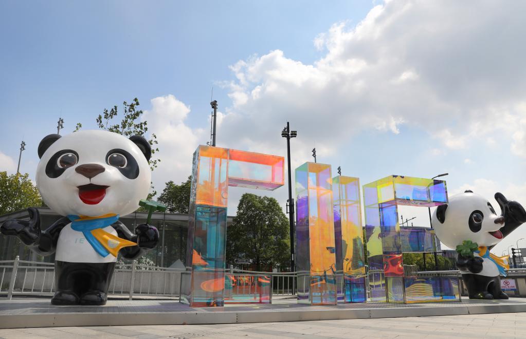 这是国家会展中心(上海)北入口外的进博主题装饰(10月15日摄)。(新华社记者方喆摄)