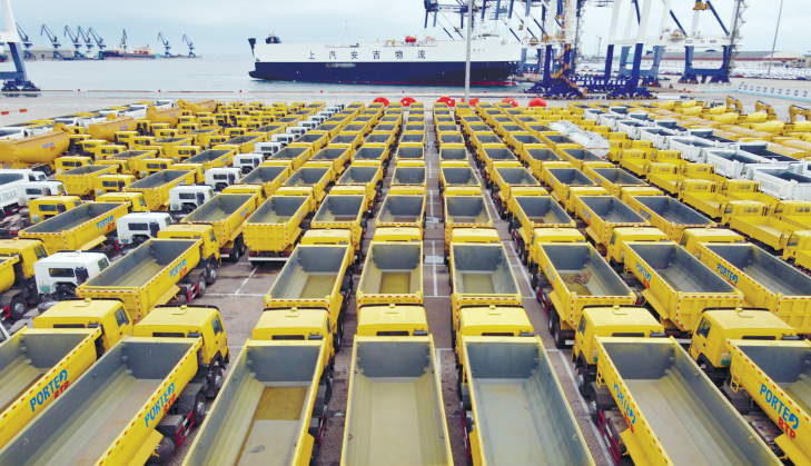 大批出口工程机械在山东港口烟台港等待装船。YMG全媒体记者 唐克 摄