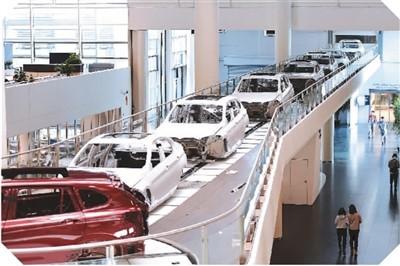 图为在华晨宝马沈阳铁西工厂,生产中的车辆穿过办公区。