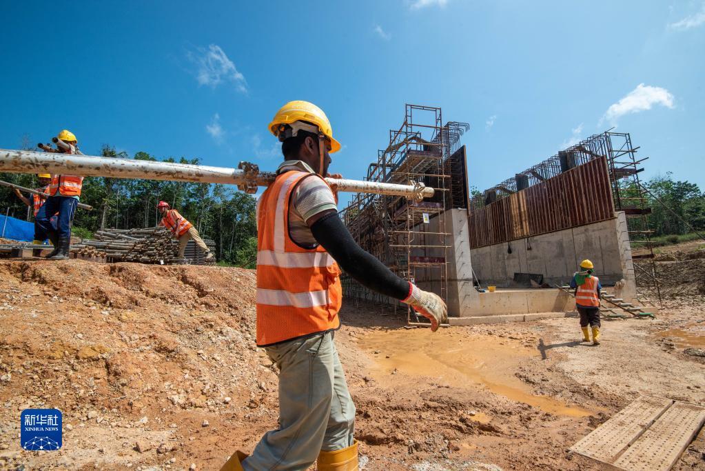 3月6日,工人在马来西亚彭亨州金马梳的马来西亚东海岸铁路(马东铁)沿线施工。新华社发(张纹综摄)