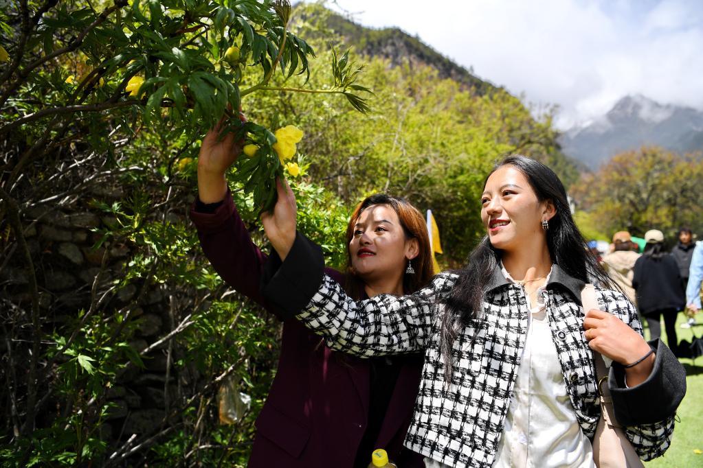 5月28日,两名游客在米林市南伊珞巴民族乡扎贡沟观赏野生大花黄牡丹。新华社记者 张汝锋 摄