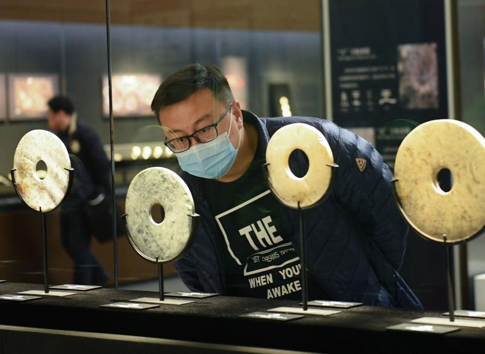 游客在良渚博物院观看出土的玉璧(2022年3月2日摄)。新华社记者 翁忻旸 摄