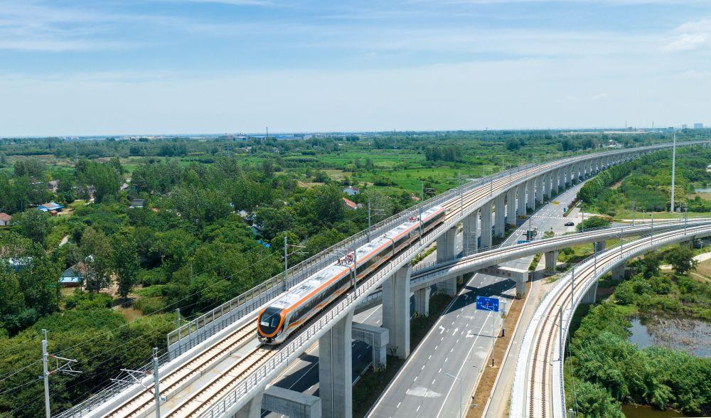 这是在安徽省滁州市来安县境内拍摄的滁宁城际铁路列车(2023年6月28日摄,无人机照片)。当日,滁宁城际铁路滁州段开通运营。滁宁城际铁路西起滁州高铁站,止于正在规划建设中的南京北站,全长约55公里。