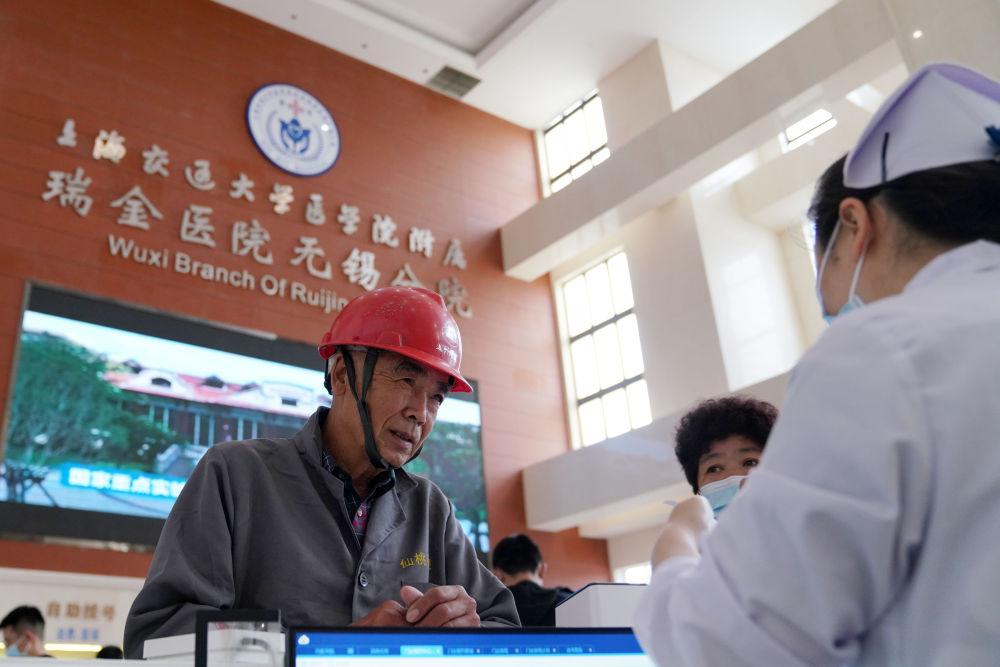 2023年5月18日,在位于江苏省无锡市的上海交通大学医学院附属瑞金医院无锡分院,就诊者在服务台咨询。