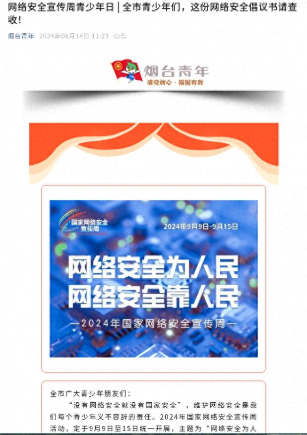 为引导广大青少年增强网络安全防范意识,积极营造健康文明的网络环境,共青团烟台市委开展2024年网络安全宣传周青少年日“四个一”系列活动。
