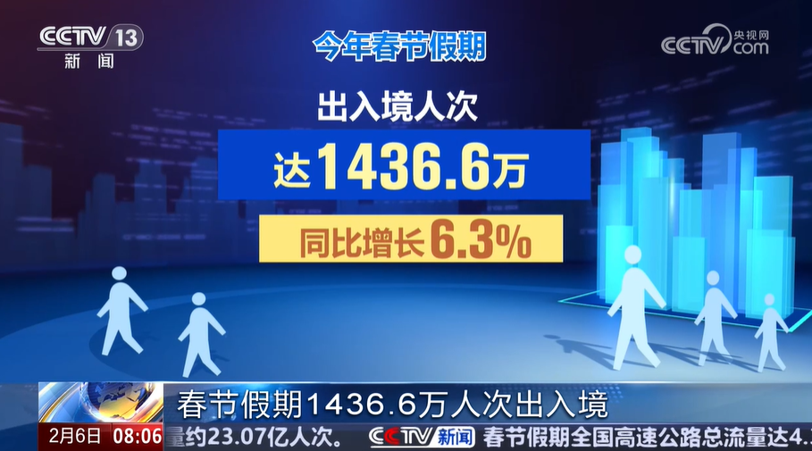 据国家移民管理局统计,今年春节假期出入境人次达1436.6万,同比增长6.3%。其中,内地居民出入境767.1万人次,同比增长5%;港澳台居民573.7万人次,同比增长5.6%;外国人95.8万人次,同比增长22.9%。