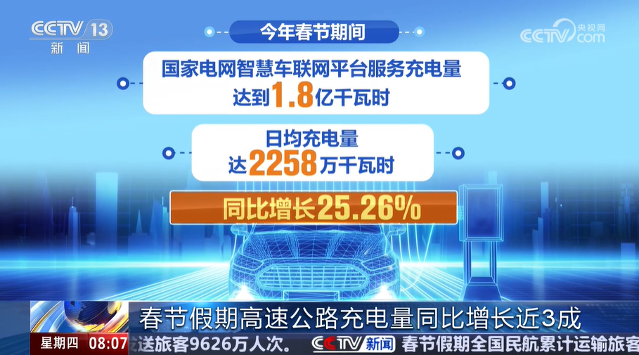 今年春节假期,国家电网智慧车联网平台服务充电量达到1.8亿千瓦时,日均充电量达2258万千瓦时,同比增长25.26%。其中,高速公路充电量达到5727万千瓦时,日均充电量716万千瓦时,同比增长29.48%。