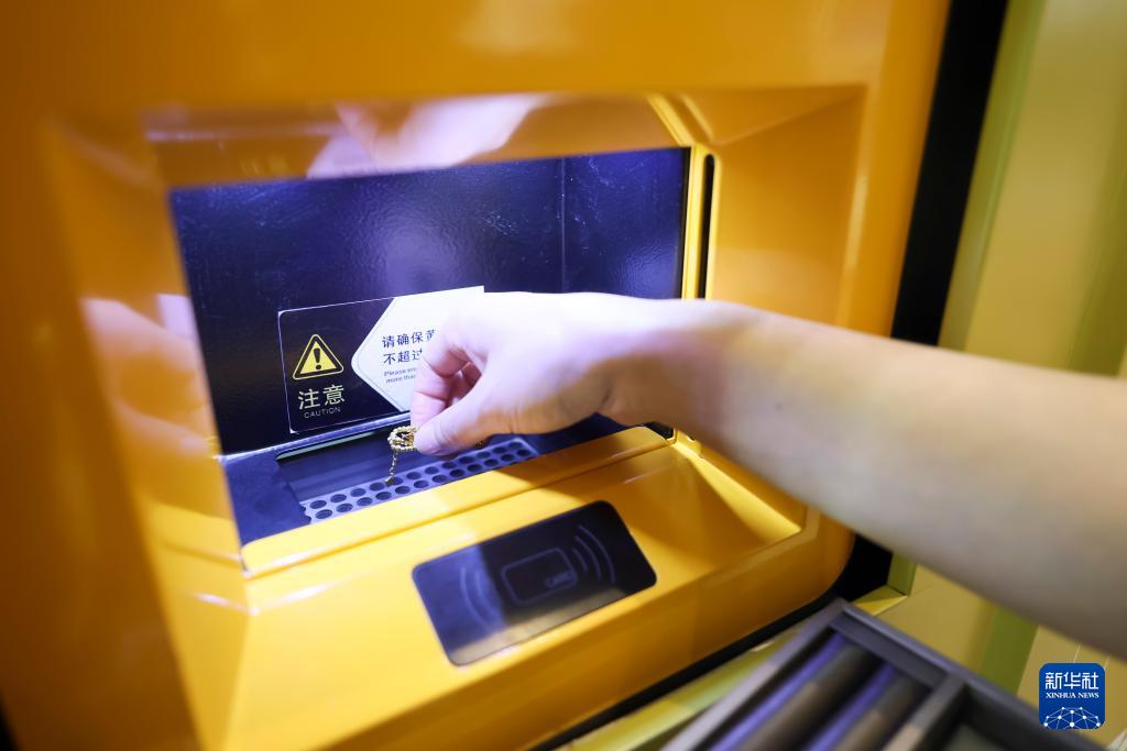 5月5日,在上海市普陀区一家商场内的“智慧金店”,工作人员将用户的黄金首饰放入智能黄金回收设备中。
