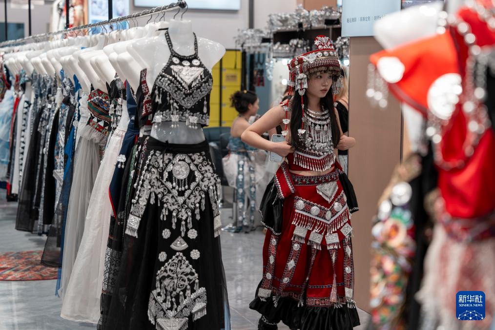 7月8日,游客在恩施土家女儿城景区体验民族服饰。