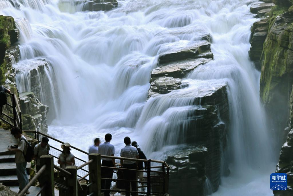 7月10日,游客在利川市腾龙洞景区游览“卧龙吞江”自然奇观。
