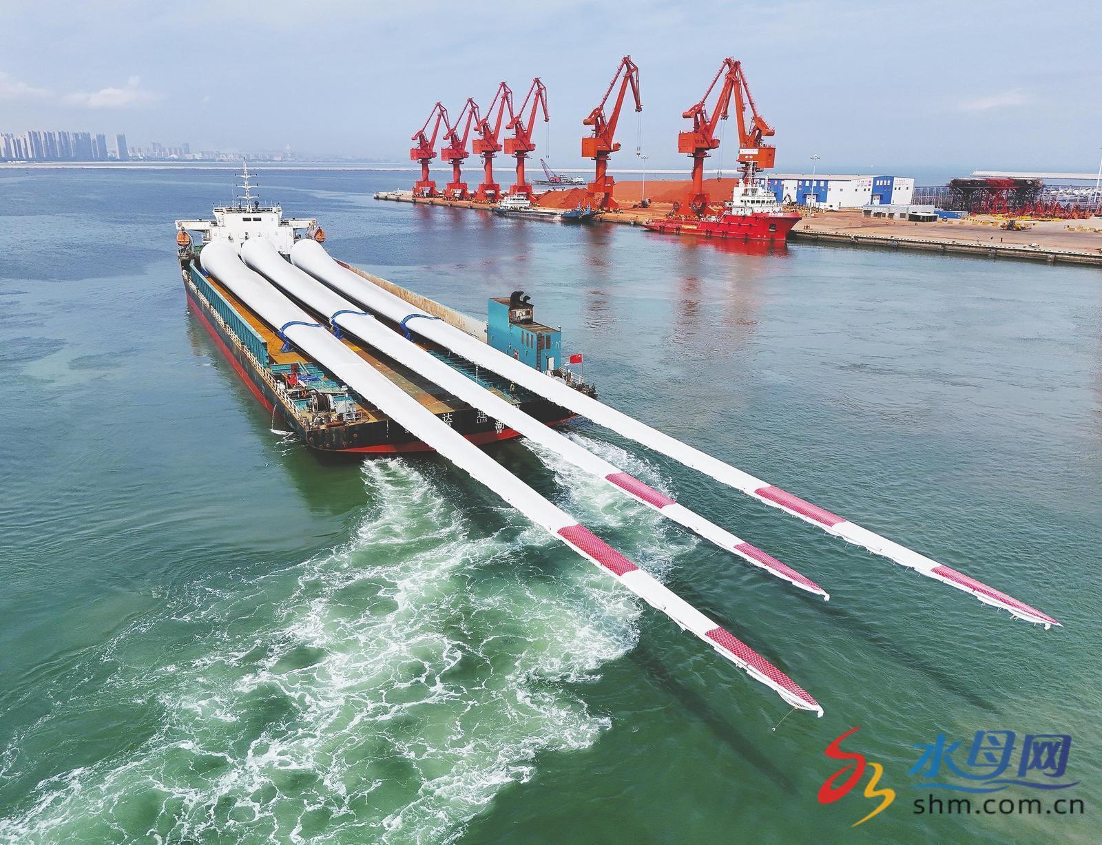 8月1日,三条由东方电气自主研发制造的26MW海上风力发电机试验叶片在山东港口烟台港蓬莱港区完成装船并运往试验基地。该型叶片长达153米,重83.5吨,是目前全球最长的海上风电叶片。烟台港凭借优质高效的物流服务和专业化能力,进一步巩固“山东港口件杂货基地”“中国北方海上风电母港”行业领先地位,为助力中国海上风电加速迈入“超大型化”发展新阶段贡献山港力量。