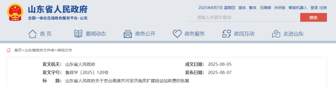 你们《关于京台高速齐河至济南改扩建段设站收费的请示》(鲁交财〔2025〕43号)收悉。根据《收费公路管理条例》等规定,现批复如下。