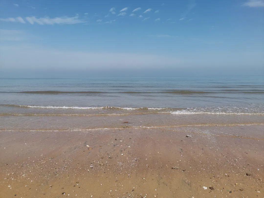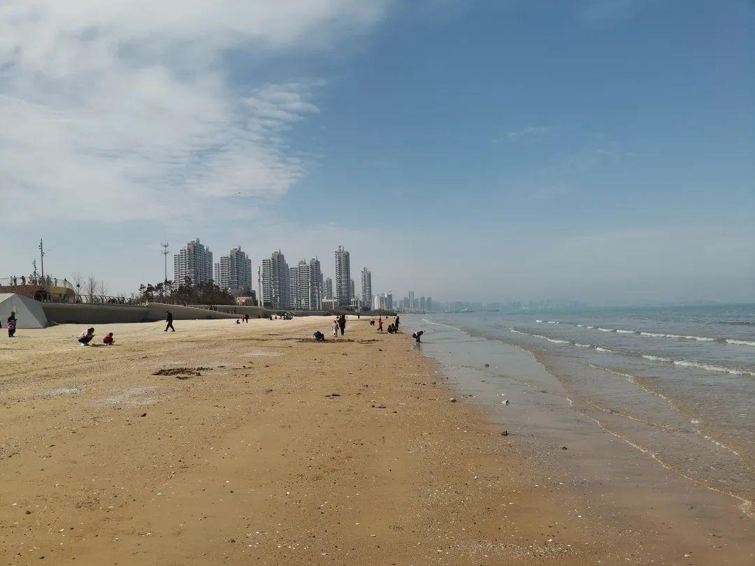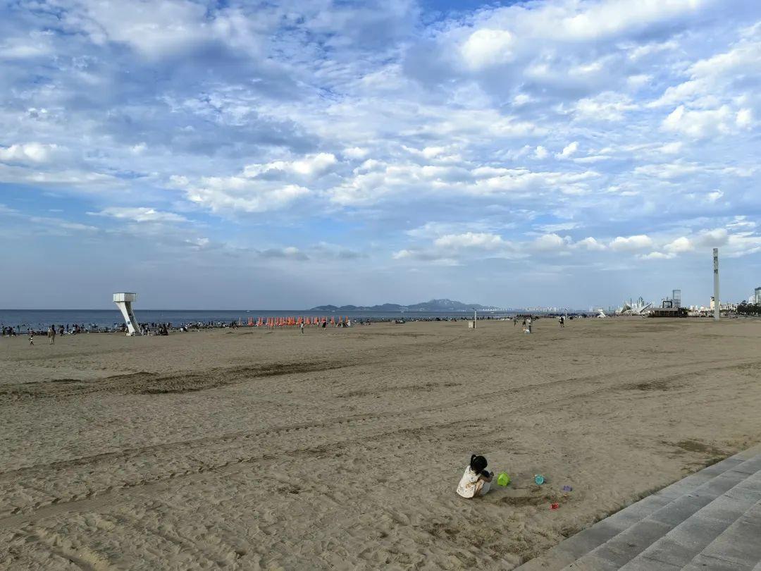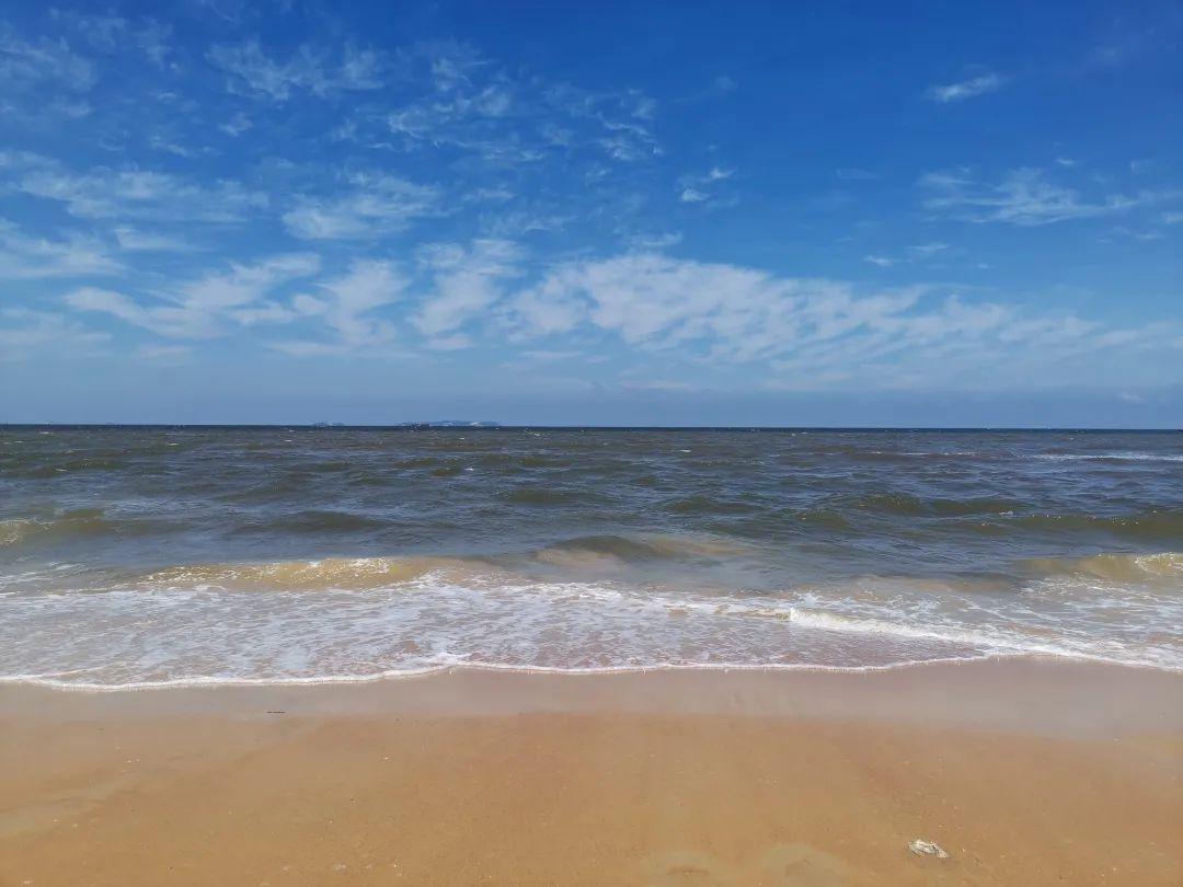 但我更钟情夏日金沙滩这片美丽的海。时光疏远,记忆遥渺依稀。行色匆匆,遇见亦是斑驳陆离。所以,黑松林之外和渔人码头那片海在自己的心中就成了一种断层和碎片化的存在。夏日遇见了金沙滩的海,烟台海岸的漫长和海的辽阔才真正有了清晰和完整的轮廓。春夏之交,很多地方已经是青绿的深原和花红的汪洋了。海上吹过的风还是在那片金色的沙滩上层叠着起起伏伏的沙山和丘壑。每天的潮涨潮落好像在中规中矩地叙述着从冬天到春天一成不变的故事。直到有一天,来了不少推沙的铲车,在来往奔忙中,沙丘平缓了。那绵延十几公里的围挡忽然不见了,从海滨路过的车上就能看到了遥远处的海天一色。云蒸霞蔚中,那些岛群若隐若现,恍若隔世。在春天向着夏天的递进里,那已经是夏日雨后清晨或黄昏特有的景致了。