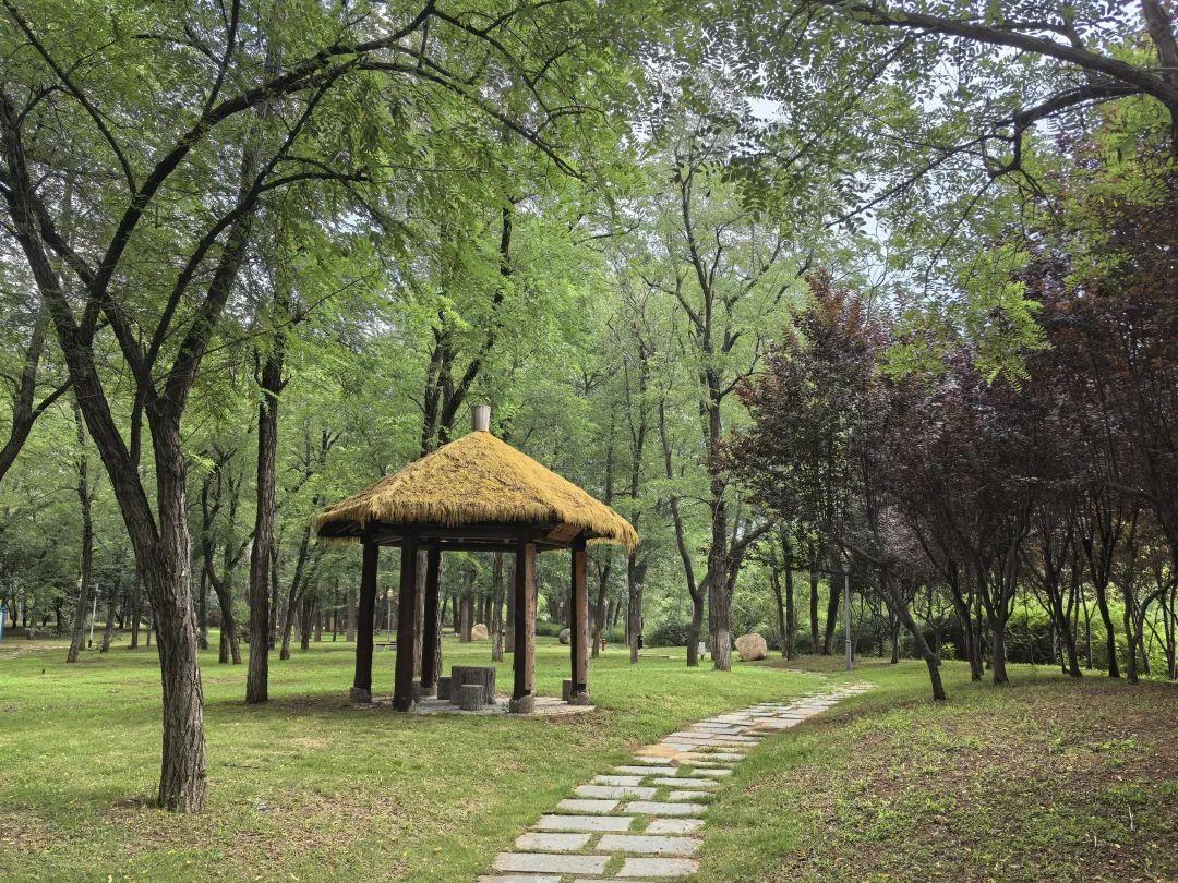 循着廊道,我在一个炎炎的夏日里与友人去了夹河生态园。相比金沙滩森林公园的幽,夹河生态公园更显静。园内除了环园的一条水泥路,四通八达的那些小径有的是用一块一块石板铺的,有的是就着起伏的地势做了一些简单处理,窄处就窄,宽处就宽,率性随意,有的小径上还从砖石间丛生出葳蕤的绿草。有的在一场雨后,被土层的蚯蚓松动过,蓬松成一条土垄,踩上去松软湿润。夏日炎热,又离着闹市和海边远,到林中的人不多,很多小径都生了绿色的苔藓,少有人工雕琢和斧凿的痕迹。静静的林中隔不远处有草毡的凉亭点缀着,我看到的就有品荷亭,拾秋亭,很有诗意的名字。品荷亭两边的柱子上是两句诗“品高叶向晴空碧,质雅根从污淖白。”让人想起荷花亭亭玉立,一花独秀的样子。