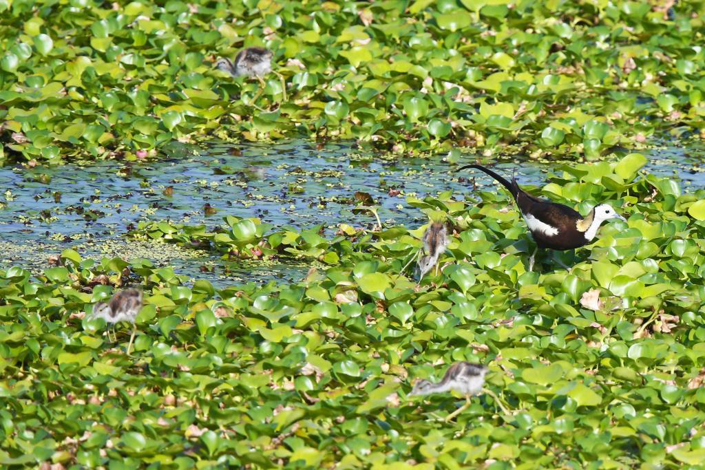 沉湖湿地的水雉及其幼鸟。(谭文卓 摄)