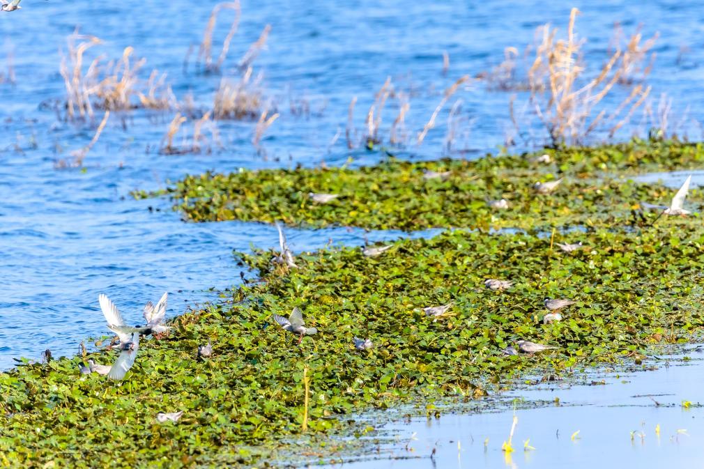 不久前结束的7月鸟类调查,共记录鸟类45种、超过3.2万只,其中灰翅浮鸥种群数量突破3万只,首批雏鸟顺利出巢,还记录到水雉、棉凫、小鸦鹃3种国家二级保护鸟类。截至目前,沉湖湿地共监测到鸟类301种,其中有20种鸟类分布数量超过全球种群总量的1%。