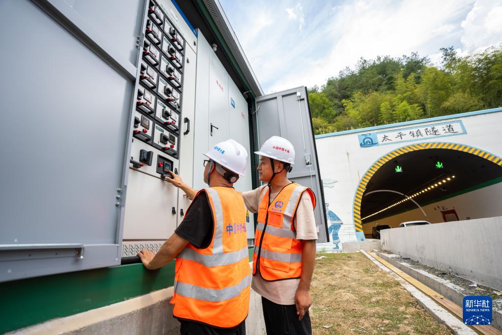 8月19日,在湖南炉慈高速太平镇隧道出入口,中铁十局技术人员调试隧道供电设备。