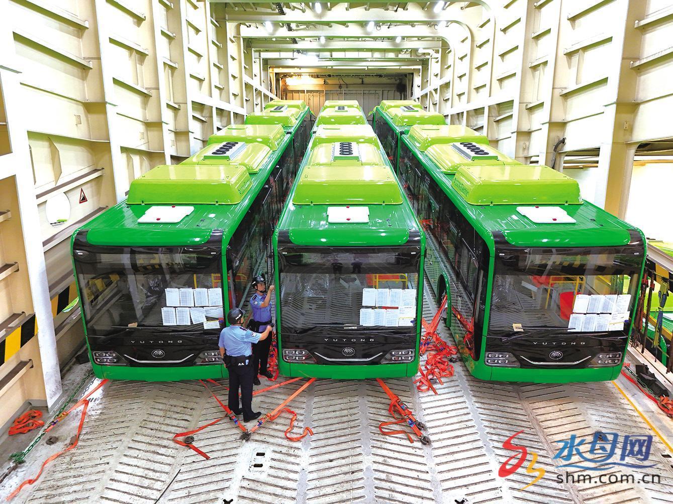 近日,在装有出口巴基斯坦的新能源公交车的货轮上,烟台边检站民警在对货物和船舶进行检查。连日来,110辆国产新能源公交车在山东港口烟台港装船,随后将发往巴基斯坦,标志着烟台港“新三样”出口通过能力再上新台阶。今年1-7月份,烟台港共完成新能源汽车出口2.5万辆,同比增长88%。 YMG全媒体记者 唐克 摄