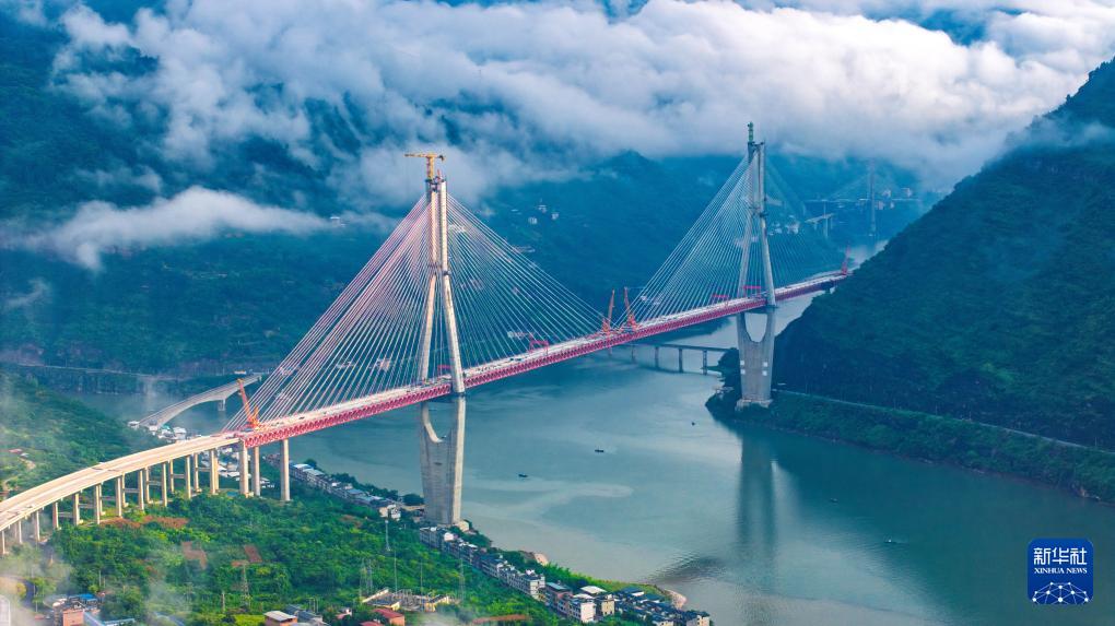 新市金沙江特大桥起点岸位于四川屏山新市镇,止点岸在云南绥江南岸镇,大桥总长1867米,主跨680米,主塔总高度297.51米,属于双塔双索面钢桁梁斜拉桥。该桥是连接川西滇北高速公路网的关键节点,建成通车后将对于畅通川滇两地交通、推动经济社会发展意义重大。