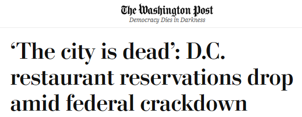 美国首都被“军管”的这几天,犯罪率有没有打下来,民主共和两党各说各话;但众多当地餐厅公开抱怨,餐饮业营收因美国政府的“执法行动”遭受了重大打击,“今年8月对华盛顿的餐厅来说格外艰难”。