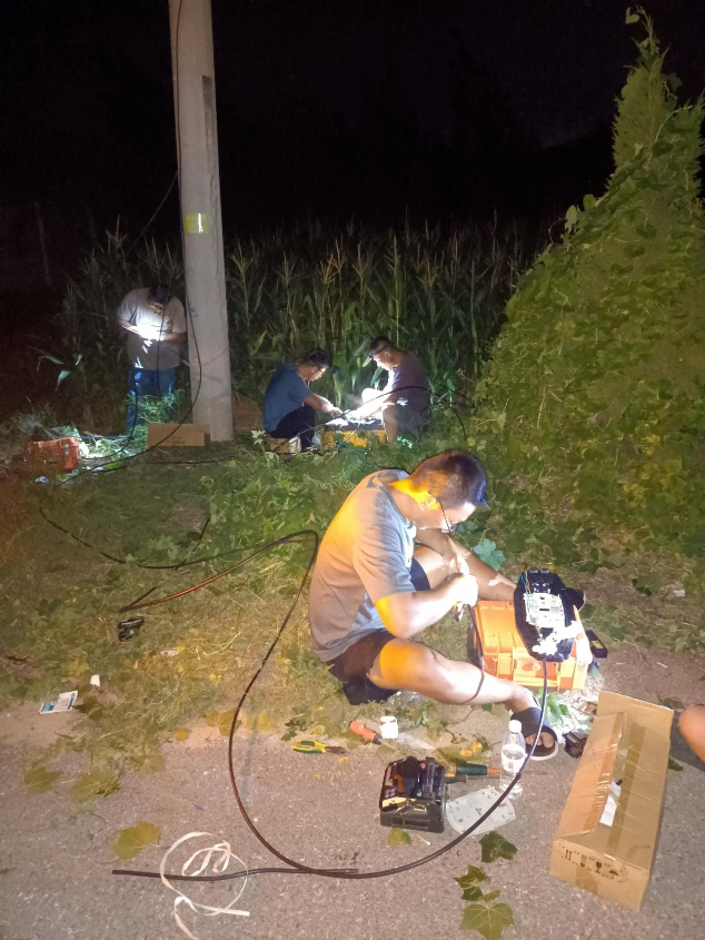 抢修期间,工作人员攀爬线杆,借助微弱灯光细致排查故障点;在庄稼地里专注进行光缆熔接,克服夜间操作视野差、野外蚊虫叮咬、机房内超40℃高温等多重困难。经过三个半小时持续奋战,当晚11时30分,所有中断通信全部恢复,用户网络恢复正常使用。