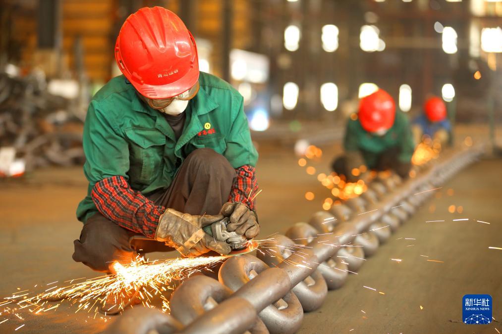 连日来,在位于山东省青岛市即墨区灵山街道的即墨区锚链产业园生产车间,工人加班加点赶制出口到海外市场的“订单锚链”产品,满足客户需求。