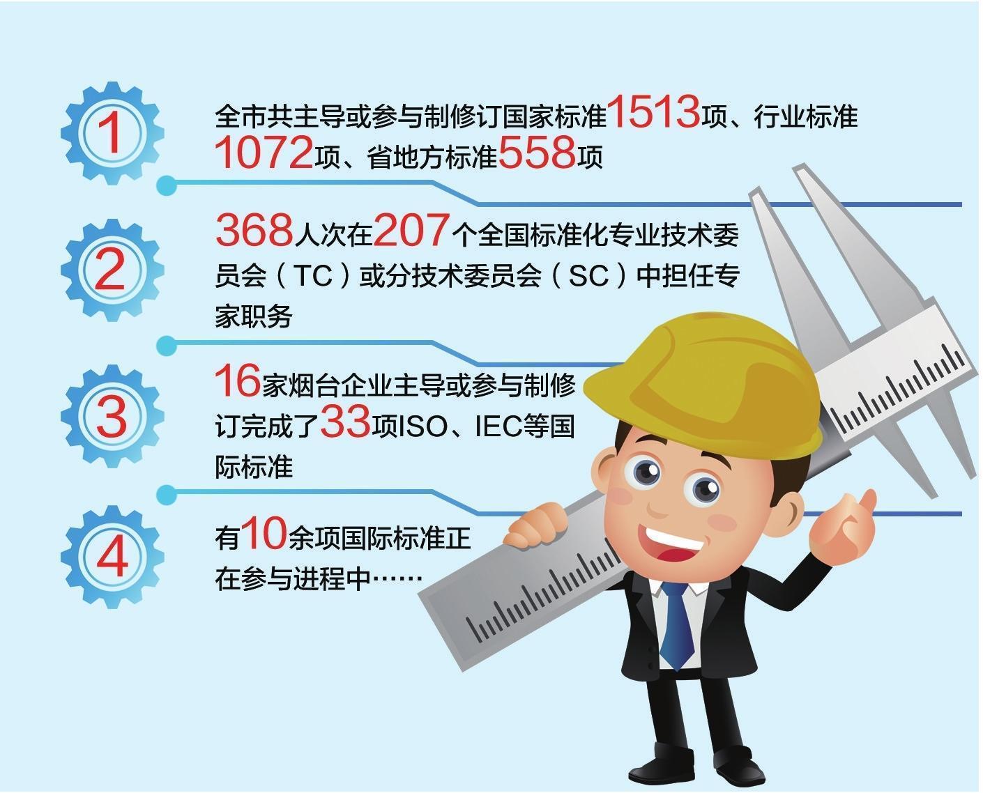 标准作为重要的基础性制度,是支撑产品质量提升、促进产业高质量发展的重要技术力量。近年来,烟台市市场监管局针对重点领域和优势产业,会同行业主管部门建立标准化工作协同推进机制,进一步完善政策保障和激励机制、搭建长效交流沟通平台、依托专家团队强化技术支撑,着力培育了一批企业创新主体,推动研制了一批关键共性技术标准,每年推动跟进一批重要标准化项目落地落实,实现区域标准化水平持续优化、标准化成果量质齐增。截至目前,全市共主导或参与制修订国家标准1513项、行业标准1072项、省地方标准558项,368人次在207个全国标准化专业技术委员会(TC)或分技术委员会(SC)中担任专家职务,承担省级以上标准化技术委员会秘书处(含工作组)7个;特别是在推动企业参与国际标准化方面取得突破性进展,从2012年仅有1家企业参与国际标准制定,到现在已有16家烟台企业主导或参与制修订完成了33项ISO、IEC等国际标准,另有10余项国际标准正在参与进程中,越来越多的烟台标准走上国际舞台,为更多烟台企业“走出去”提供坚实支撑。