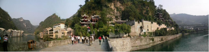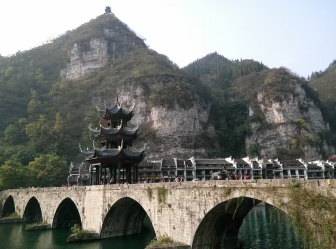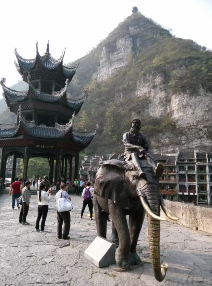 我们一行几人,随着导游,踏上了进城的祝圣桥;边听导游讲解,边看沿途的风景。进入视野的是青山绿水和祝圣桥及桥上的铜像和楼阁;我们心中疑惑,为何叫祝圣桥?桥上建楼阁的用意是什么?导游便向我们解释:“祝圣桥原名舞溪桥,始建于明洪武年间,经过多次修复,清雍正元年修复竣工时,正值康熙皇帝圣诞,为向皇帝祝寿,更名为祝圣桥。该桥为滇黔学子进京赶考必经之路,桥上的楼阁是清朝光绪年间镇远知府倡捐修建的,希望学子们能够魁星点斗,高中状元。楼阁是一座木质的三层穿斗式结构,三重檐,八角攒尖,覆以青筒瓦顶,俗称‘魁星阁’或‘状元楼’”。