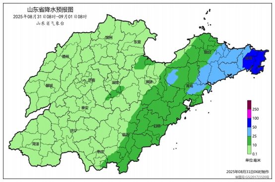 山东省气象台于8月31日06时00分继续发布暴雨蓝色预警。