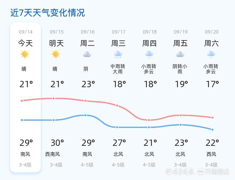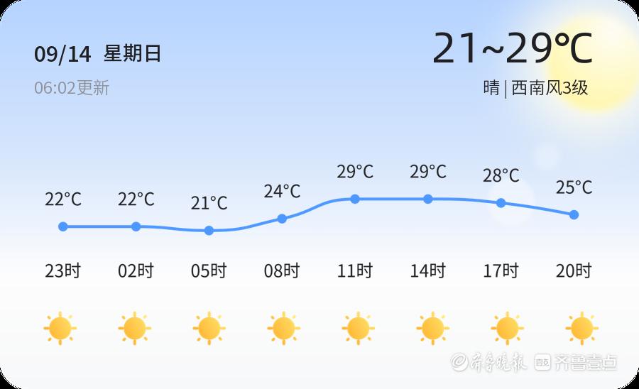 今天是9月14日,农历七月廿三,烟台市迎来了一天的晴好天气。当前气温为21.9℃,整体天气状况良好,各区气温在21℃至29℃之间波动,西南风3级,空气湿度为93%,PM2.5指数为23,空气质量良好。市民们可以在晴朗的天气中享受户外活动的愉悦。
