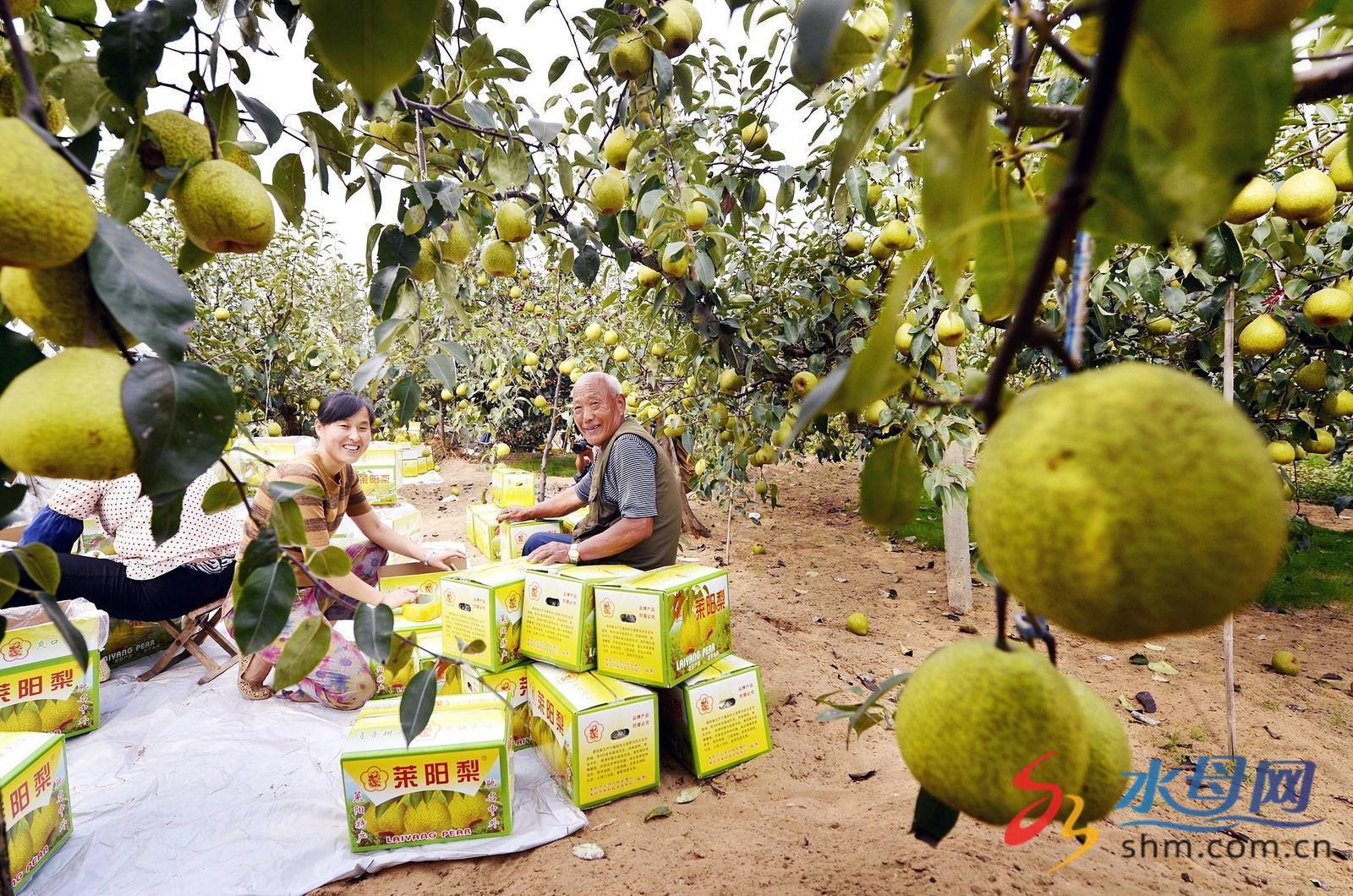 在莱阳市“梨满田园”乡村振兴齐鲁样板省级示范片,果农在采收成熟的梨子。(资料片,烟台市农业农村局提供)