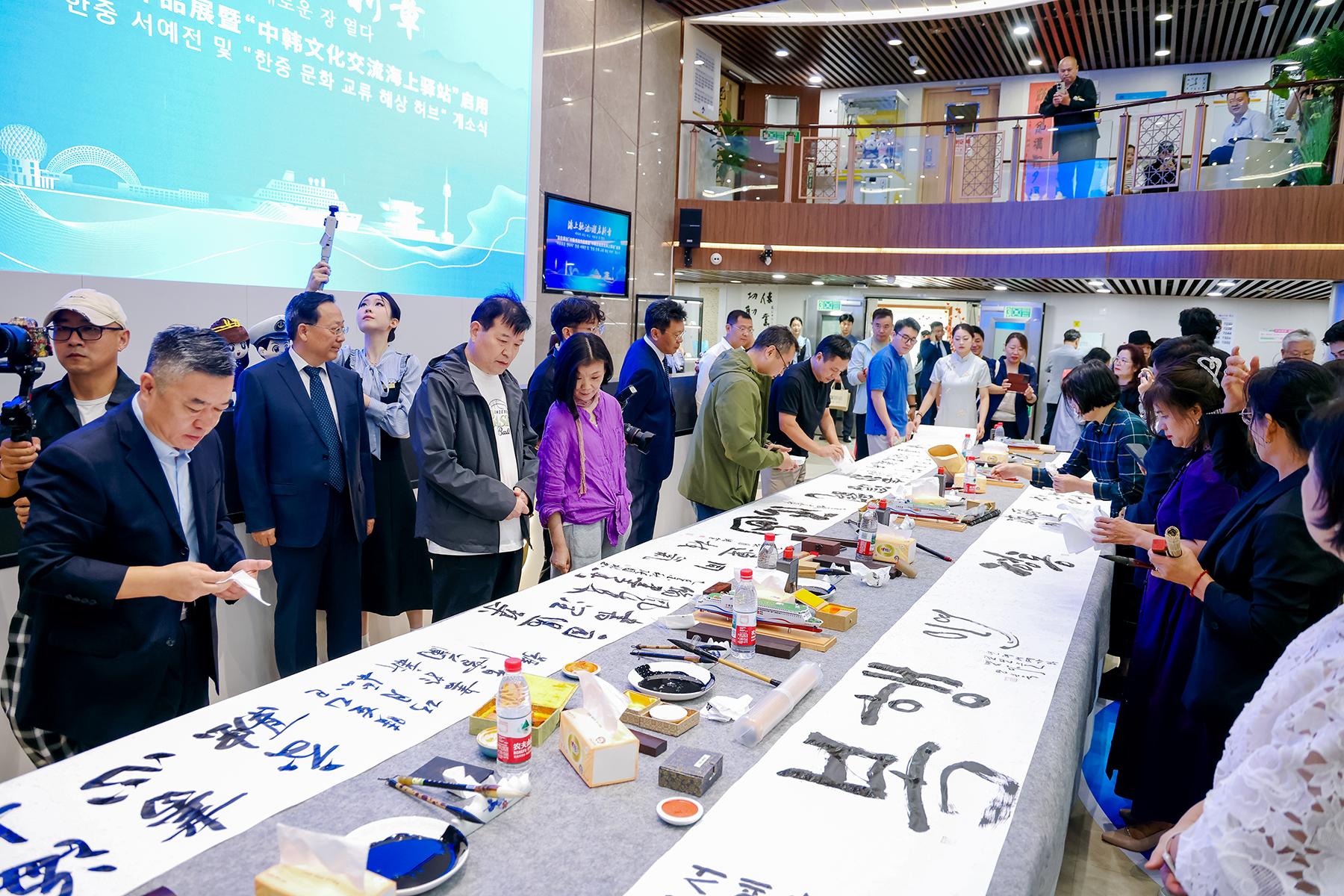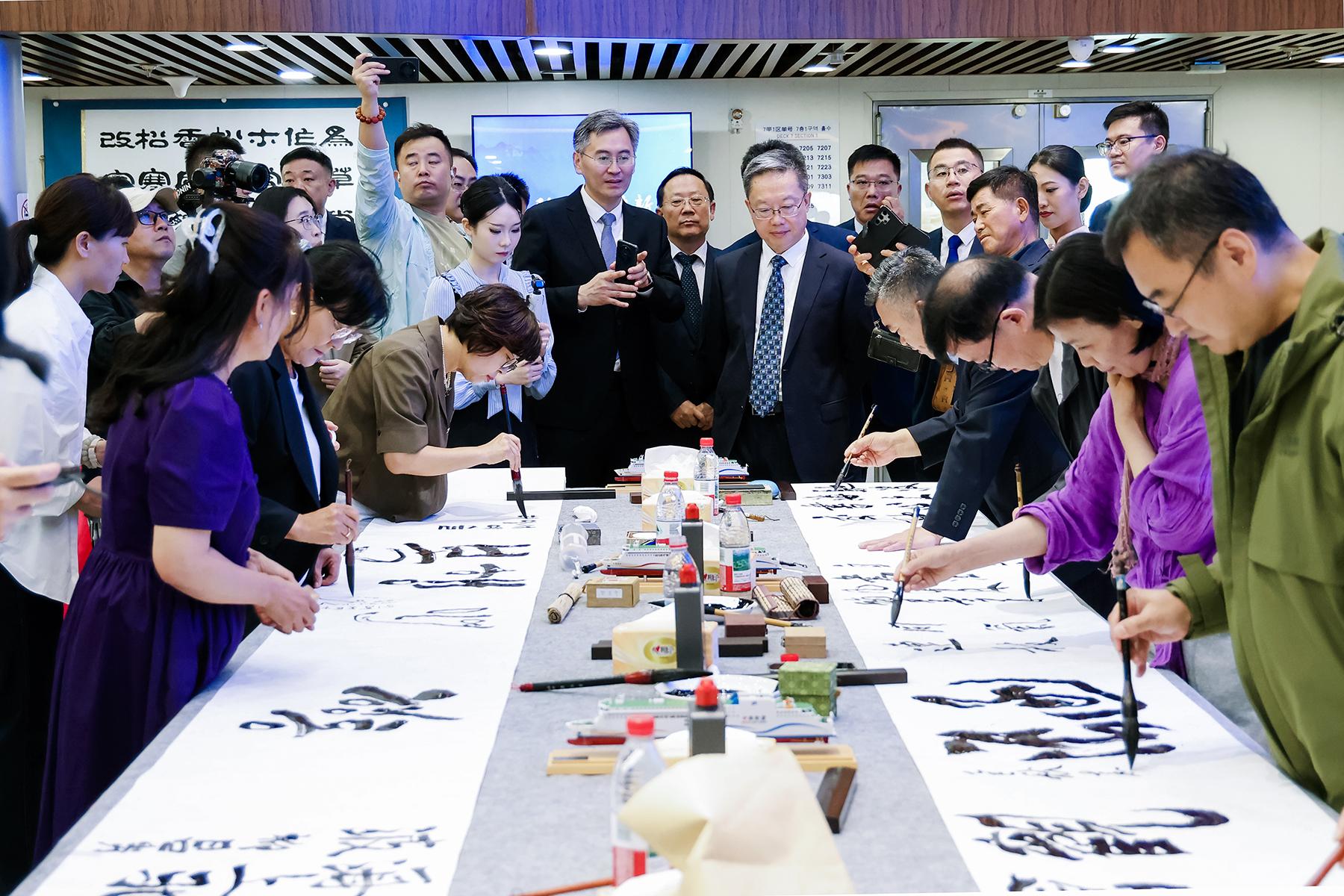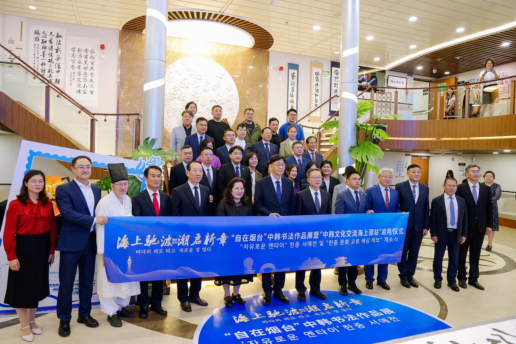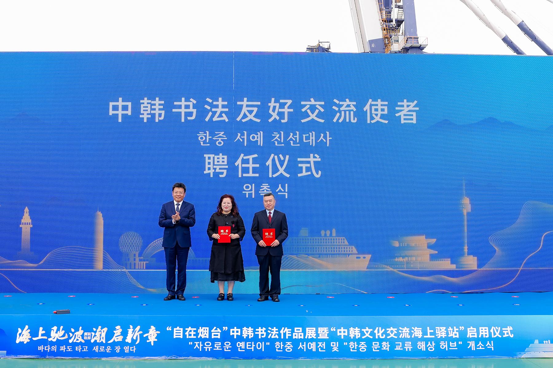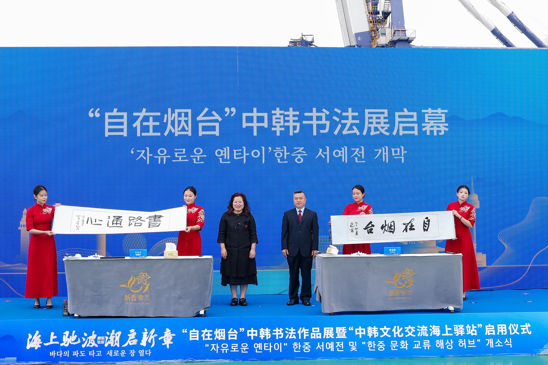 书法艺术作为中韩共享的文化瑰宝,成为本次活动的一大亮点。今年8月8日,“自在烟台”中韩书法展在韩国唐津实现首展。此次展览回归烟台,开幕环节中,烟台书法家协会主席姜玉松与韩国常绿书法家协会名誉会长金鏞男携手题写“自在烟台 书路通心”,标志着展览正式由韩至烟完成跨国接力。二人同时被聘为“中韩书法友好交流使者”。此次在中韩轮渡“新香雪兰号”上展出两国书法家150余幅精品力作,展出结束后将在山东商务职业学院续展。
