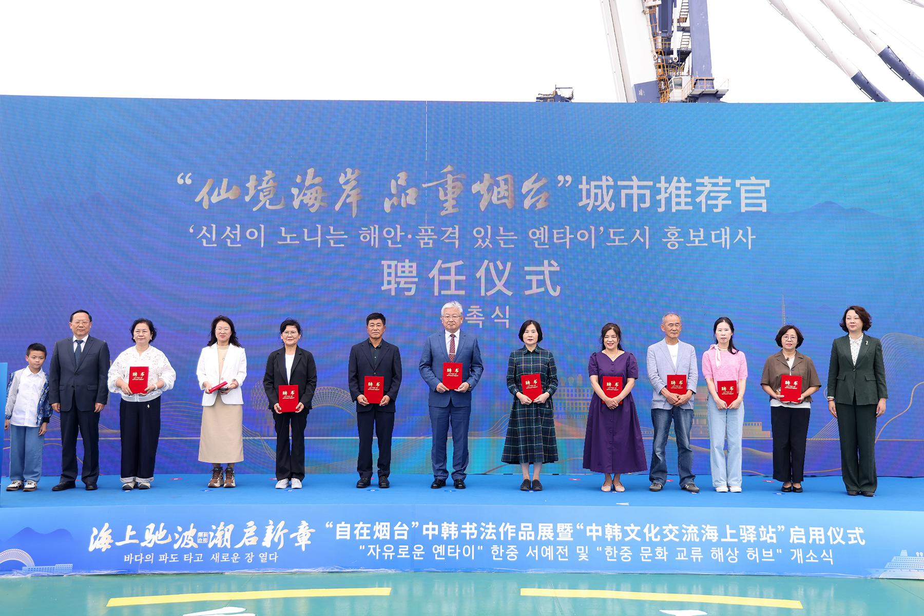此外,11位来自韩国的书法艺术家与企业家受聘为“仙境海岸·品重烟台”城市推荐官。烟台韩人商工会会长金正昊作为代表发言,表达了对烟台宜居宜业环境的赞赏,并表示将积极推介烟台,推动两地合作走深走实。