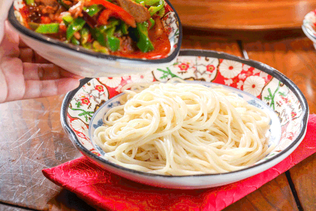 拌面也叫“拉条子”,筋道爽滑的面条配上蔬菜、羊肉,皮牙子、西红柿、青红辣椒拌匀,吸溜一口到嘴里,再就上一口蒜,根本停不下来。