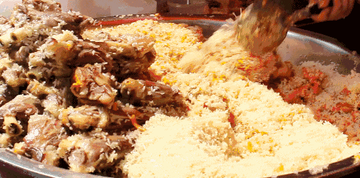 抓饭是新疆人生活中一道不可或缺的美食。葡萄干、杏干、胡萝卜、羊肉等与大米焖煮,很能激起人的食欲。