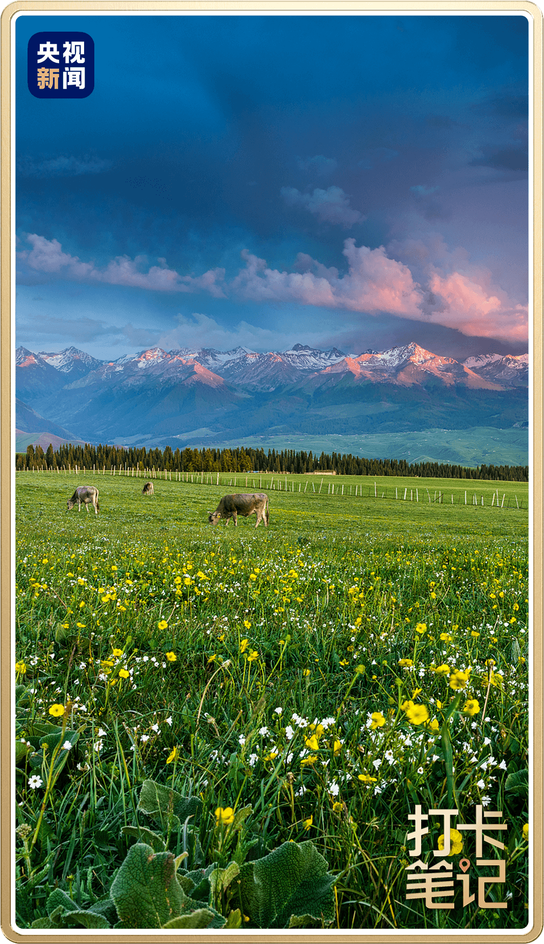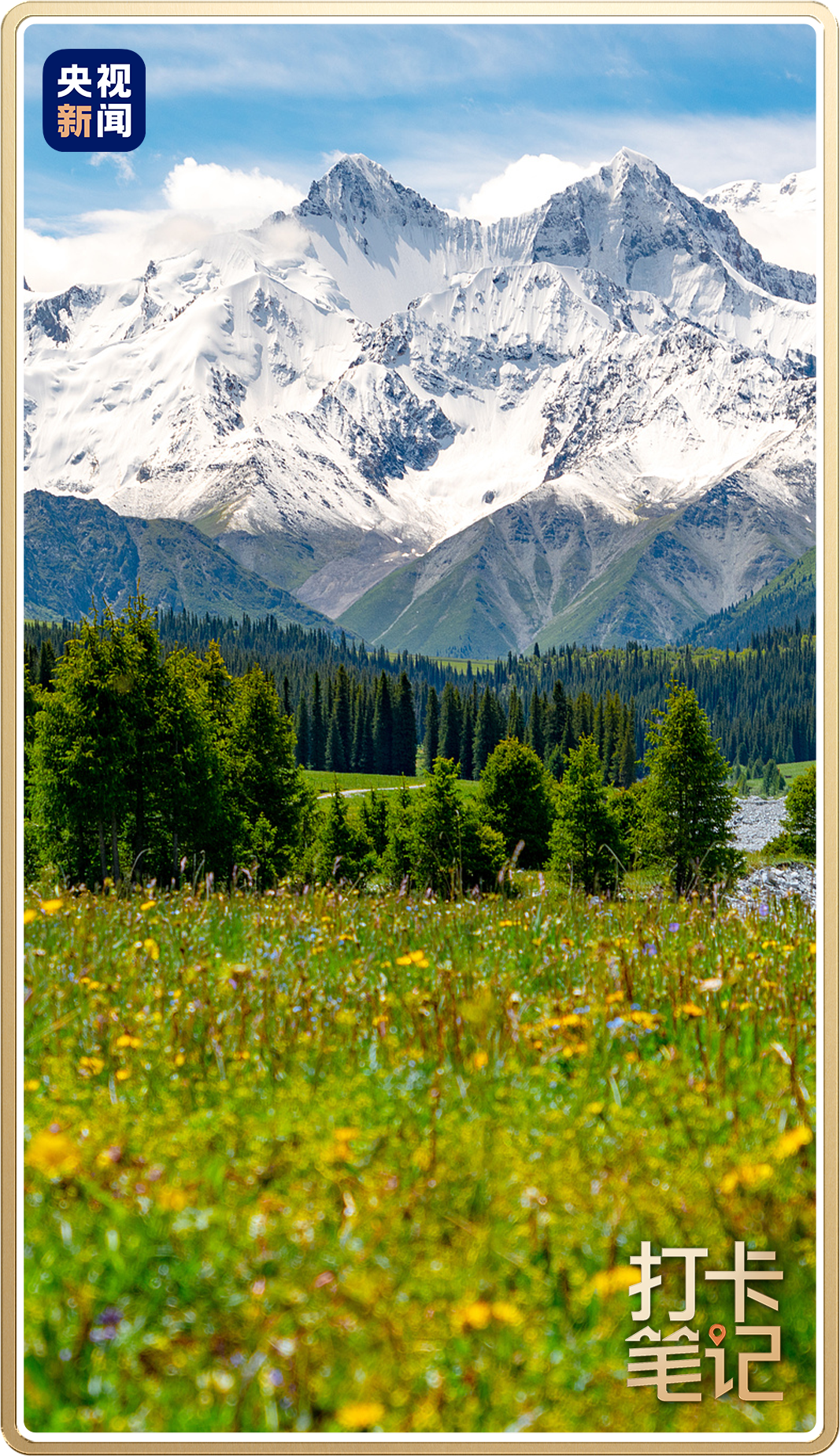 在昭苏西部的夏塔古道沿线,沿途遍布野花、牛羊、溪流,远处有天山木扎尔特冰川风光,一派世外桃源的景象。