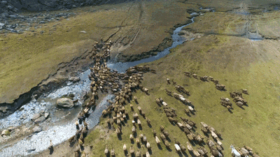 阿勒泰地区有1.33亿亩天然草原,山地起起伏伏,形成了垂直分布不同的四季牧场。牧民每年转场数次,跋涉近千里,保证牲畜四季都能吃到“时令美食”。